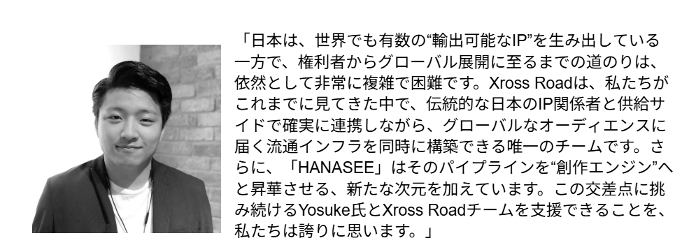 extra mile株式会社(本社:東京都港区六本木5-2-1 ほうらいやビル 7F)、代表取締役:玉手 栄)が事業ライセンスを開発する、IP(知的財産)創出と流通のためのインフラプロジェクト「Xross Road(クロスロード)」は、AIマンガ制作ツール「HANASEE(ハナシー)」の開発体制強化を目的として、プレシードラウンドにて総額150万米ドルの資金調達を実施いたしました。