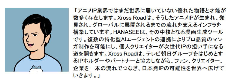 Xross Road、AIマンガ制作ツール「HANASEE」開発に向け150万ドルの資金調達を実施。
