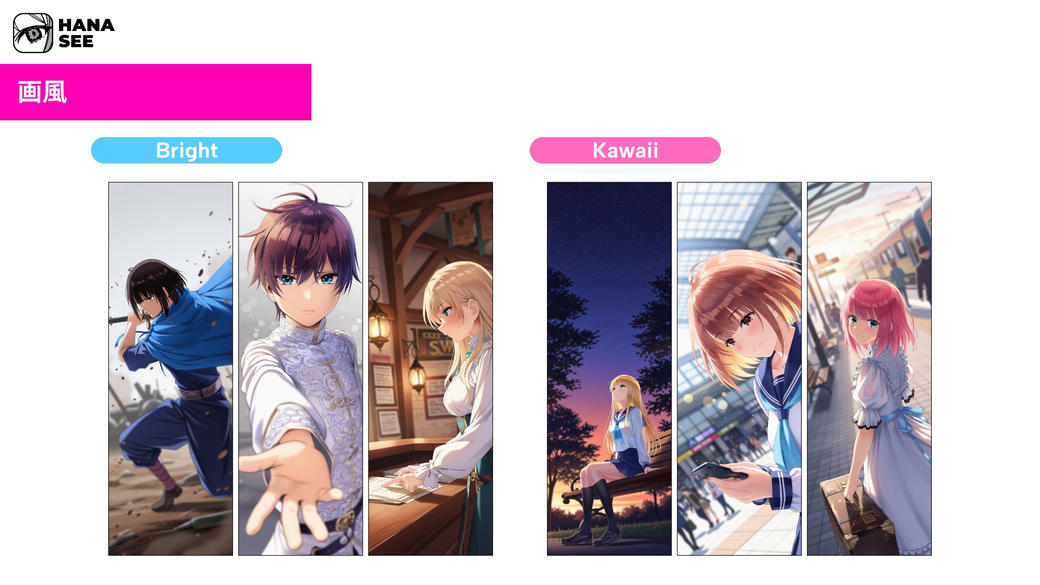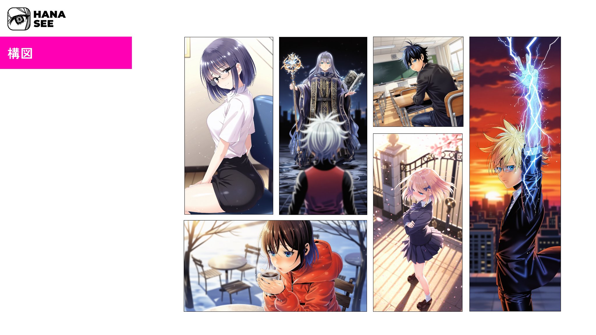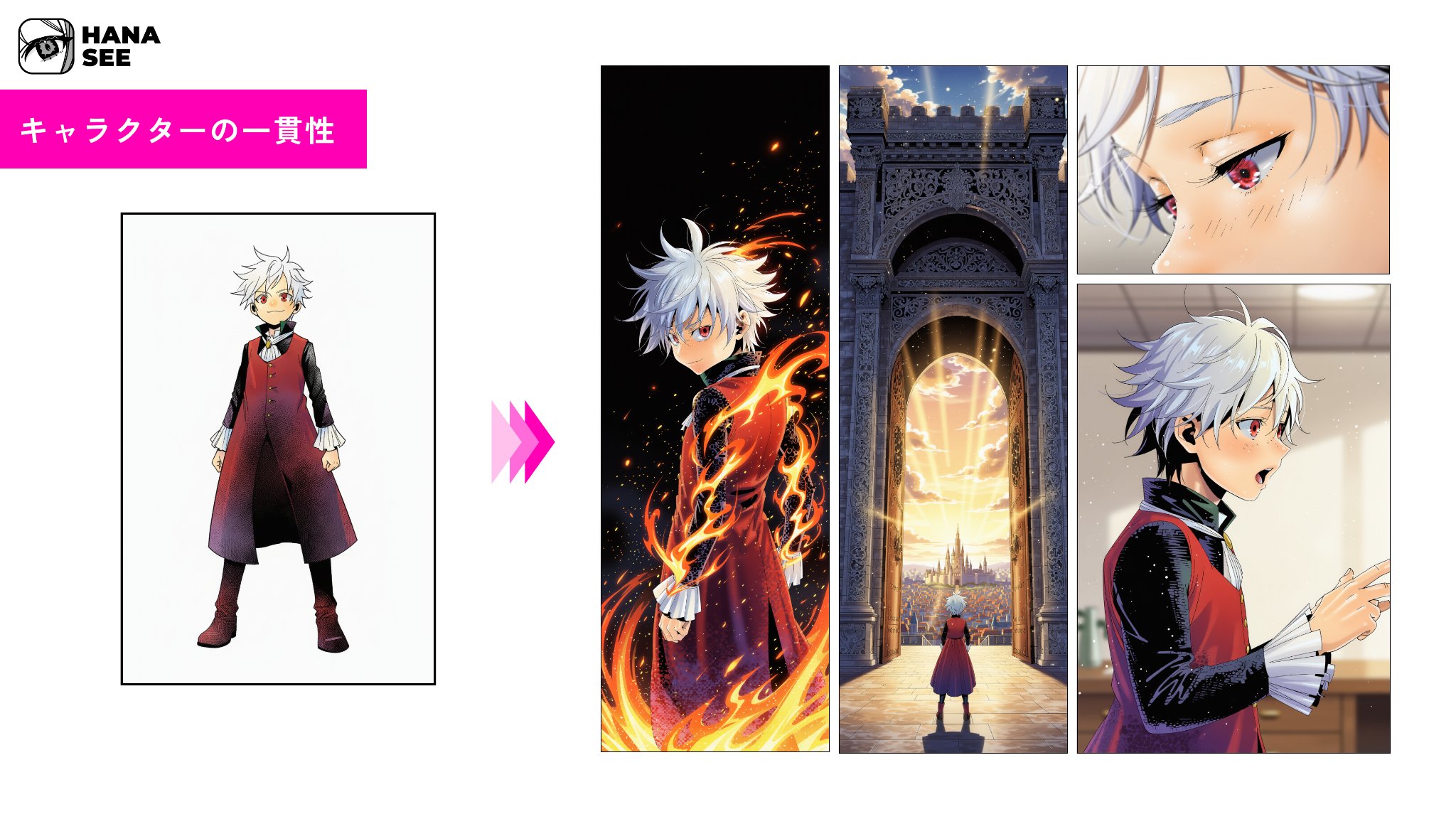 「HANASEE」は、アイデアやストーリーを縦読みマンガとして創作できるマンガ創作プラットフォームです。小説や、ストーリーの原型となるアイデアをもとに、キャラクター・世界観・画風が一貫した連載マンガを、独自の画像生成モデルおよび創作ワークフローによって生み出すことが可能です。