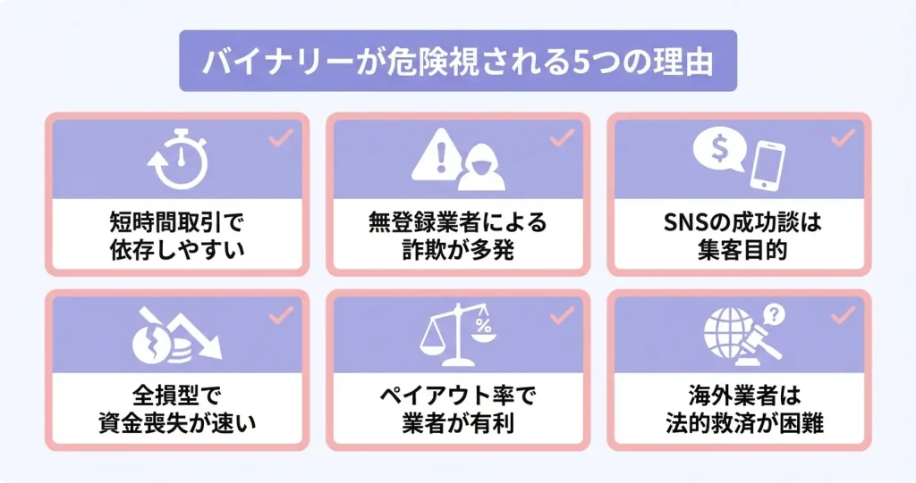 構造上、業者側が有利な設計になっており、長期的に利益を出し続けることが統計的に難しい仕組みである点が、投資対象として「やばい」と評価される根本的な理由です。