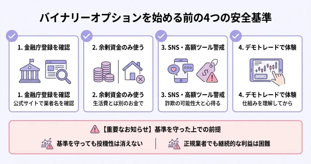 ここまでで、合法的な国内業者における投資リスクと、詐欺的な勧誘による金銭被害という2つの「やばい」要素が見えてきました。次のセクションでは、これらを踏まえた上で、実際にバイナリーオプションに取り組むべきか判断するための基準を整理します。