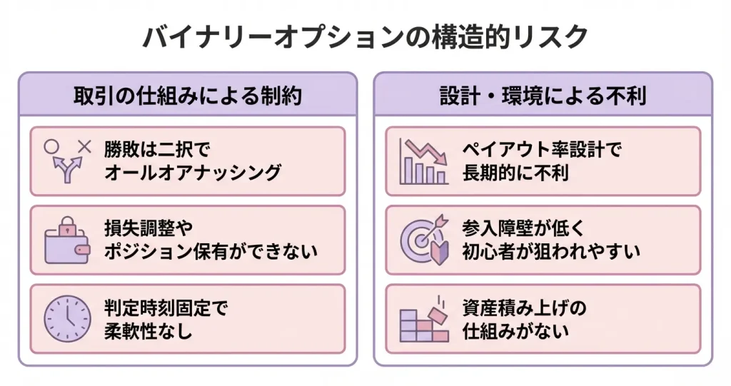 一見すると「上がるか下がるかの二択」でフェアに見えますが、実際にはペイアウト率が100%を下回るため、勝率が50%程度では確実に資金が減っていきます。