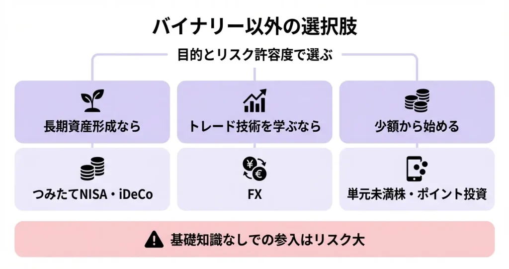 ここでは、バイナリーオプション以外の代表的な選択肢と、それぞれが向いている人の特徴を整理します。