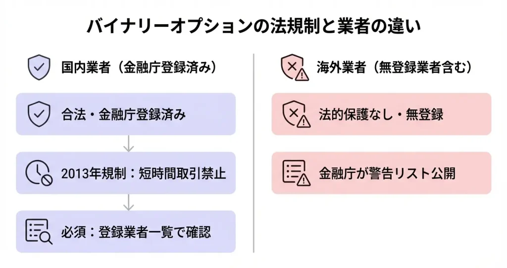 このセクションでは、国内と海外の業者における法的な位置づけと、金融庁による規制の実態を整理します。合法的に取引できる環境かどうかを判断するための基準を確認していきましょう。
