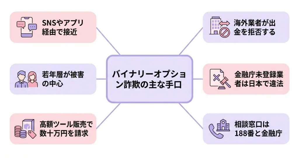 バイナリーオプションに関連する詐欺は、投資の初心者を狙った巧妙な手口で行われています。
