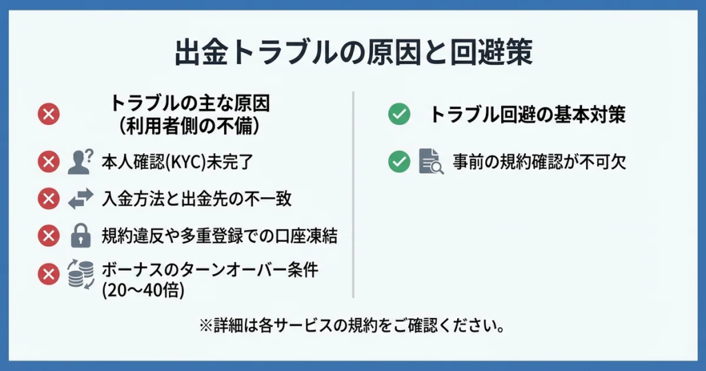 出金に関するトラブルの多くは、ボーナス条件の未達や本人確認の未完了を見落としたことが原因として挙げられます。